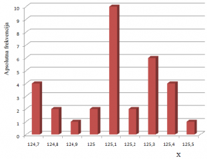 Slika 3. Histogramski prikaz rezultata mjerenja parametra X (125±0,5)