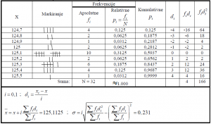 Da bi se upravljalo procesom, odnosno da bi se ocijenio proces po pitanju kvaliteta realizacije, potrebno je pratiti ključne parametre. Slučajnim izborom uzet je uzorak od 32 komada posmatranog proizvoda i na tom uzorku mjereni su ključni parametri. Rezultati mjerenja parametra X (125±0,5 mm) dati su u Tabeli 1.